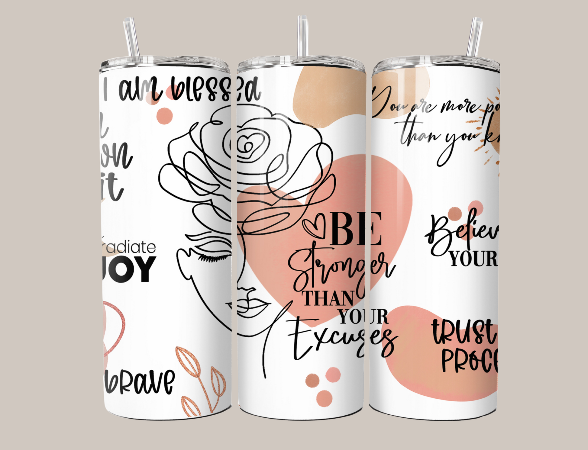 Stay hydrated and motivated with our BE STRONGER THAN YOUR EXCUSES TUMBLER. This 20oz tumbler keeps your drink hot or cold while reminding you to push past your limits. Don't let excuses hold you back, be stronger than them!