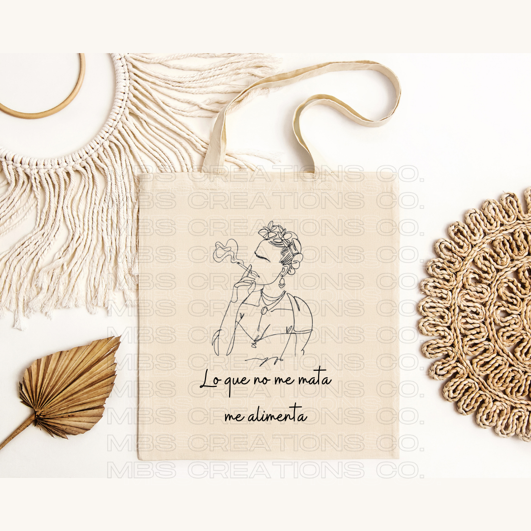 Get ready to slay (or tote) with the FRIDA TOTE! Made from 100% cotton, this tote is not only durable and cute, but also features a sassy "What doesn't kill me" print. Perfect for carrying all your essentials with a side of attitude.
